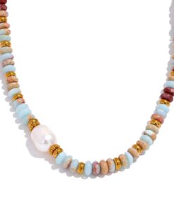 Apportez une touche d’élégance intemporelle à votre tenue avec ce collier fait à la main, composé de perles d’eau douce délicates et de pierres naturelles de turquoise.